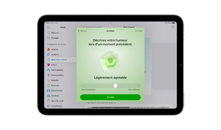 Votre santé mentale est tout aussi importante que votre santé physique – en fait, elles vont de pair. Des études montrent qu’en reconnaissant vos émotions, vous pouvez mieux les gérer et même ralentir votre fréquence cardiaque, ce qui a des effets bénéfiques sur le corps. Des fonctionnalités pratiques sur iPhone, iPad, Apple Watch et Apple Vision Pro vous invitent à réfléchir à votre état d’esprit ainsi qu’à développer votre conscience émotionnelle et votre résilience.