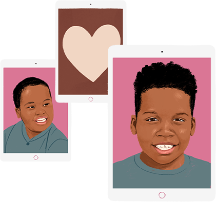 Illustrated portrait of Nafisah smiling, looking at the reader; an illustrated iPad enters the frame, displaying an image of a heart symbol. Illustrated portrait of Nafisah smiling, looking at the reader; an illustrated iPad enters the frame, displaying an image of a heart symbol. Illustrated portrait of Nafisah smiling, looking at the reader; an illustrated iPad enters the frame, displaying an image of a heart symbol. An illustrated iPad enters the frame, displaying an image of a heart symbol. An illustrated iPad enters the frame, displaying an image of a heart symbol. More illustrated iPad devices entering the frame, displaying images of children. More illustrated iPad devices entering the frame, displaying images of children.