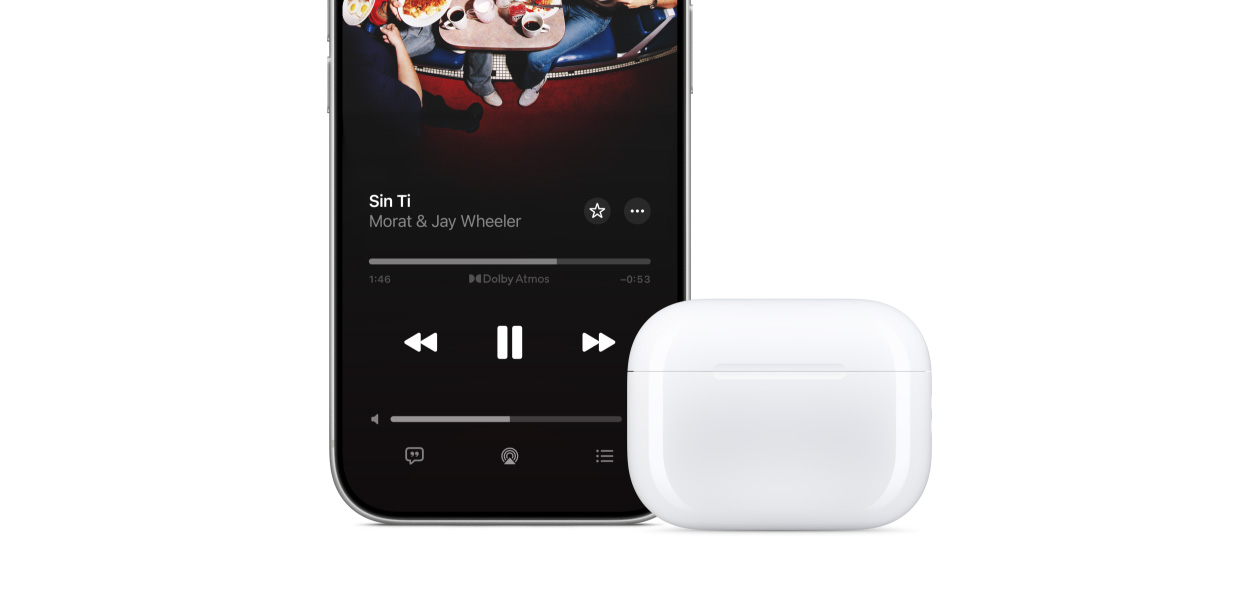 Comparte lo que estás escuchando o mirando muy fácilmente con otra persona.24 Sólo pídele que acerque sus AirPods al iPhone, el iPad o el Apple TV al que estás conectado. Y eso es todo.