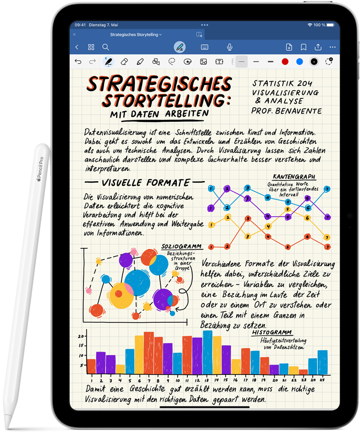 Zeichnen, Notizen machen und Dokumente kommen­tieren – der Apple Pencil zeigt, wie sich das anfühlen sollte: intuitiv, präzise und einfach magisch. Mit pixel­genauer Präzision, niedriger Latenz, Neigungs­sensitivität und Unterstützung für Handflächen­­erkennung ist er ganz einfach zu benutzen und immer bereit für deine Ideen.