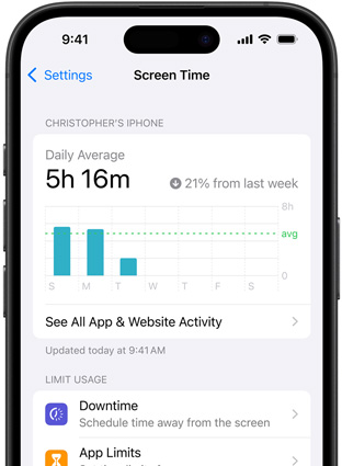 Screen Time gives you a better understanding of the time you and your kids spend using apps, visiting websites, and on your devices overall. You can get weekly reports or see specific app usage, notifications, and device pickups.