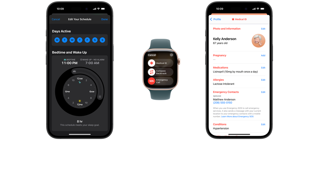 On iPhone and Apple Watch, emergency personnel can quickly access a Medical ID with important information like allergies, blood type, emergency contacts, and more.