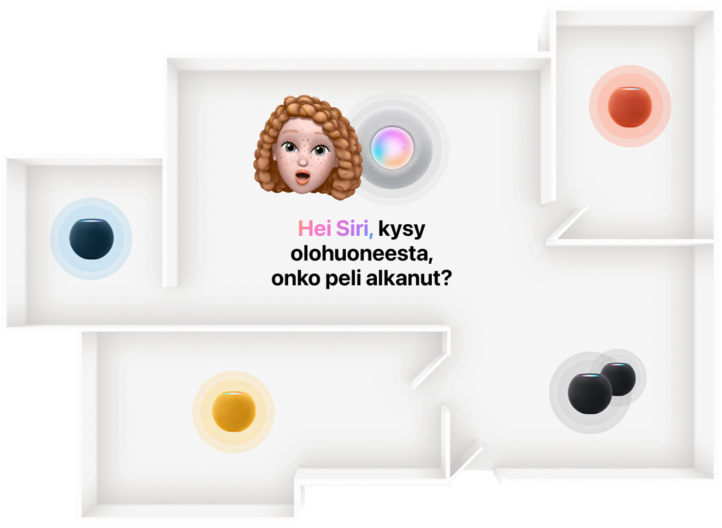 Sijoittamalla useita HomePodeja ja HomePod mini ‑kaiuttimia eri puolille asuntoa voit nauttia koko kodin kattavasta äänijärjestelmästä.1 Pyydä Siriä toistamaan jotakin kappaletta joka puolella kotia tai valitse yhtä helposti eri kappale kuhunkin huoneeseen. SharePlayn avulla myös vieraasi voivat osallistua hauskanpitoon ja valita yhdessä HomePodissa toistettavia kappaleita – vaikka heillä ei olisi Apple Music ‑tilausta.2