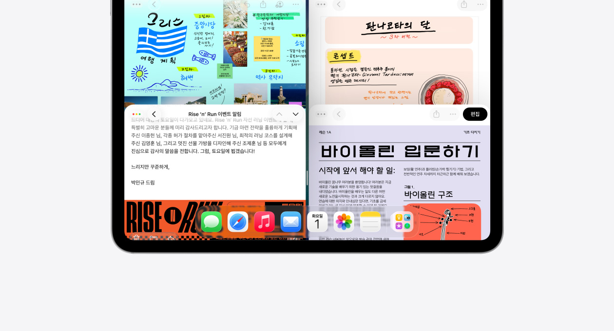 왼쪽이나 오른쪽으로 윈도우를 휙 보내 정렬할 수 있습니다. 이제 iPad 화면을 3분할 또는 4분할로 나눌 수도 있죠.