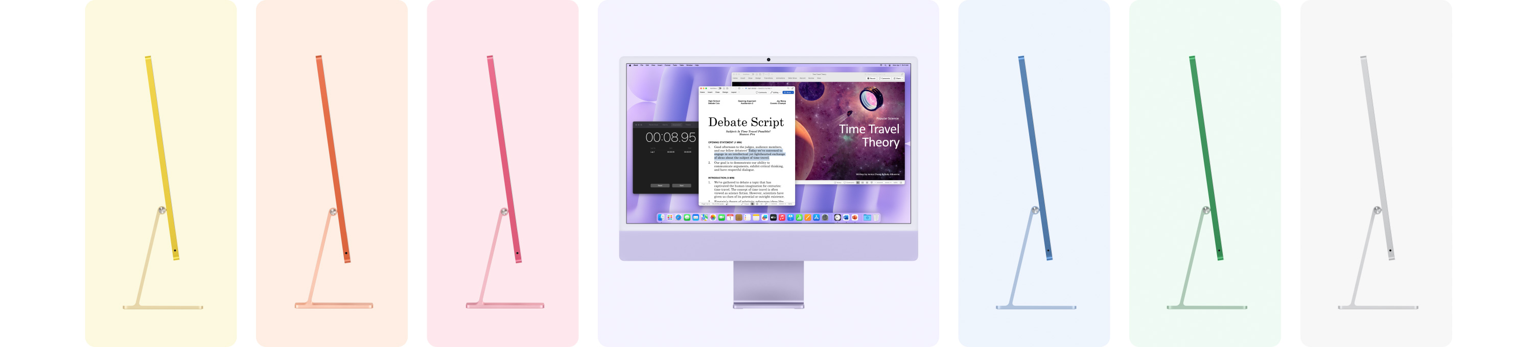 7 skirtingų spalvų (žalios, geltonos, oranžinės, rausvos, violetinės, mėlynos, sidabro) „iMac“, pateikti akordeono forma