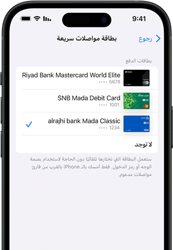 • لكي تضمن تسديد الرسوم المتوجبة بطريقة الدفع التي اخترتها فقط، احرص دائماً على إبقاء بطاقاتك الفعلية بعيدة عن أجهزتك من Apple عندما تدفع في وسائل النقل العام باستخدام "النمط السريع".