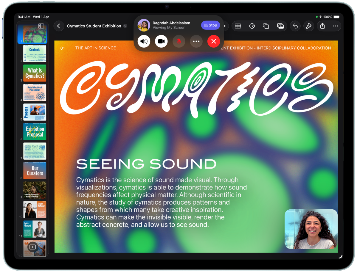iPad Air, front exterior, user is on FaceTime and looking at Keynote in front of another iPad Air, back exterior