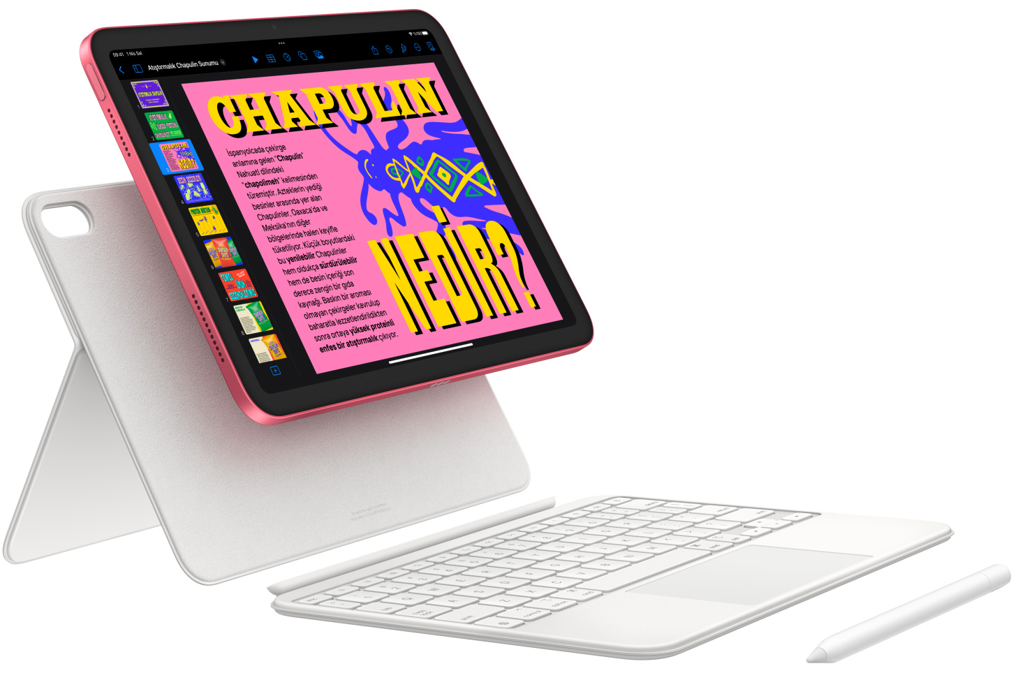 Apple Pencil ile not alın, çizim ve resim yapın. Magic Keyboard Folio’nun çok yönlü iki parçalı tasarımıyla rahatça yazın, trackpad’i kullanın ve sevdiğiniz içeriklerin keyfini çıkarın.2 İster tanıdık klavye kestirmelerini isterseniz herhangi bir yerine tıklanabilen trackpad’i kullanın. Ve harika bir yazma deneyimiyle tanışın.