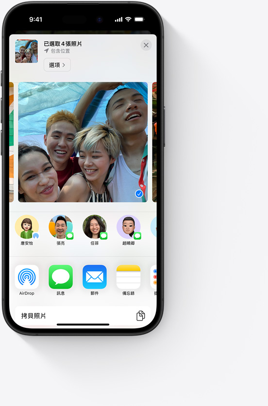 共享的照片圖庫是最佳的分享方式,可與最多達五人順暢地共享你所選的照片和影片。共享的圖庫內容會出現在「精選照片」與「回憶」中,讓你在大家拍攝的照片中,重溫你的冒險經歷。