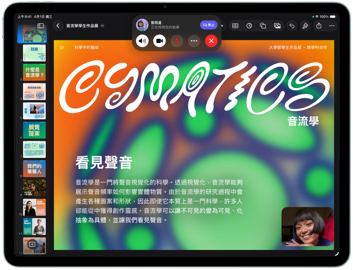 iPad Air 的機身正面外觀,螢幕畫面展示使用者一邊 FaceTime 一邊查看 Keynote。螢幕後則擺放另一部 iPad Air,展示機身背面外觀