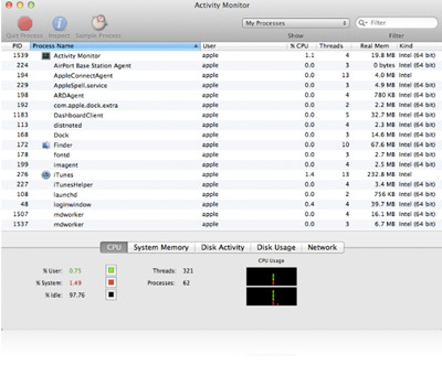 活動監視器顯示運行於 Mac 上的所有程序資訊,包括 CPU、磁碟、記憶體和網路使用情況。透過可搜尋的表格與實用圖表,或直接在 Dock 圖像中,即可清楚看到電腦資源的使用情況。你可以查看歸類在不同分組中的程序、快速搜尋程序以及退出程序。活動監視器還可輕鬆查看記憶體的使用情況和可用的記憶體容量,以及磁碟活動和網路傳輸的資料。
