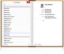 由於通訊錄整合於整個 OS X 系統之內,你只需輸入一次,即可從 Mail、iChat 以及其他應用程式存取聯絡資訊。通訊錄還可以將 Mac 上的聯絡資訊同步至 iPhone 或其他行動電話、iPad 或 iPod touch,你的通訊錄讓你可以隨身攜帶。