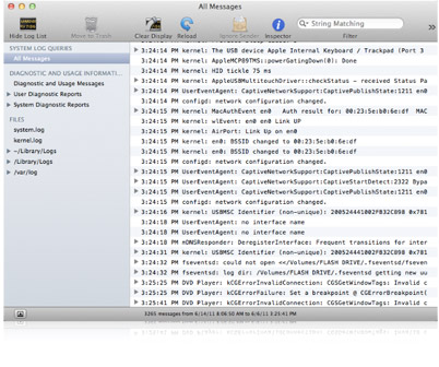 OS X 為系統中幾乎每個應用程式記錄了大量的診斷資訊,包括從日常狀態資訊到詳細的錯誤和警告。系統監視程式可讓你在中央位置監控所有這些記錄,此工具在尋找問題或要詳細了解後台工作狀況時至關重要。你可快速搜尋數以千計的訊息與郵件記錄,並刪除不要的記錄。當特定系統消息出現時,控制台會自動提醒你。