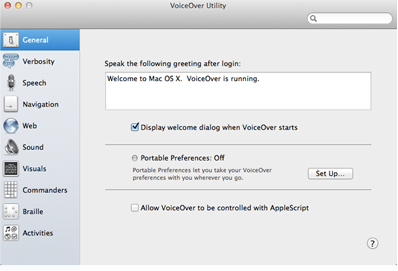 每台 Mac 均配備內建式螢幕操作軟體 VoiceOver,可朗讀電腦螢幕上出現的內容,而且只用鍵盤即可控制電腦。VoiceOver Utility 可讓你自定 VoiceOver 設定以滿足你的需要。更改聲音、調整詳細度、建立自定發音等,還可以輸出設定,並輸入到另一台 Mac 之中。