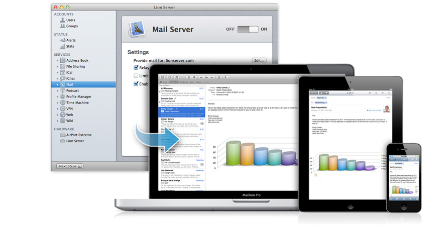 Mail Server 3 配備強化用戶端服務的新功能。 透過附件搜尋,使用者可在伺服器上搜尋電子郵件的附件內容。搜尋功能兼容所有標準檔案格式,包括 iWork 和 Microsoft Office 文件、PDF 檔案以及 QuickTime 影片。Mail Server 包括新的網上電子郵件服務,網頁設計現代美觀。它支援 RTF 和 HTML 格式的訊息、多國語言、拖放式訊息管理以及串接格式的訊息列表。