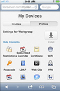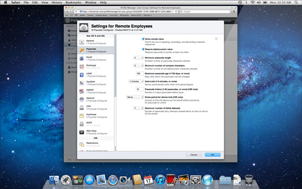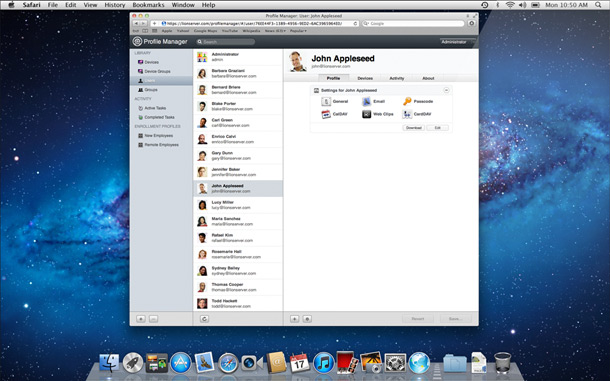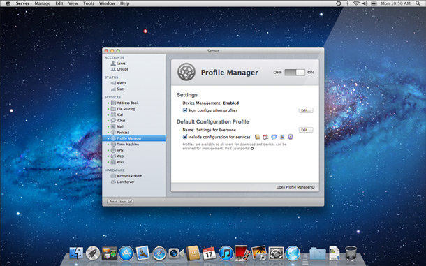 「設定檔管理程式」以簡單強大的方式,設定及遠端管理執行 Lion 的電腦、iPad 和 iPhone 等 iOS 裝置。它也簡化了新的設定檔管理程式及郵件、行事曆、聯絡人及聊天等使用者帳號的建立程序、執行限制、PIN 和密碼規則及系統設定配置等。因為「設定檔管理程式」與 Apple Push Notification 服務整合,使其可自動發送更新設定。它配備了網路管理功能,讓你可以自任何現代網頁瀏覽器管理你的伺服器。「設定檔管理程式」甚至讓使用者存取自助式網頁入口網站,下載安裝新的設定檔,清除密碼,同時遠端鎖定或移除已遺失或失竊的裝置。