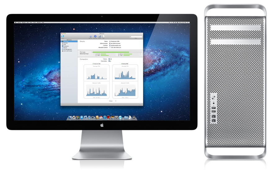 Xsan 現在內建於 OS X Lion,其檔案系統讓所有的 Mac 以適當的連線來存取 Xsan 卷宗。 Lion Server 具備 Xsan Admin 應用程式,用以控管和設定 Xsan 卷宗,你可建立不區分大小寫的 Xsan 卷宗來提高效能和易用性,就像傳統的 HFS+ 卷宗,檔名不區分大小寫字元。Lion 也支援業界標準的多重路徑和故障復原,因此 Xsan 可用於多種光纖通道 RAID 儲存陣列。